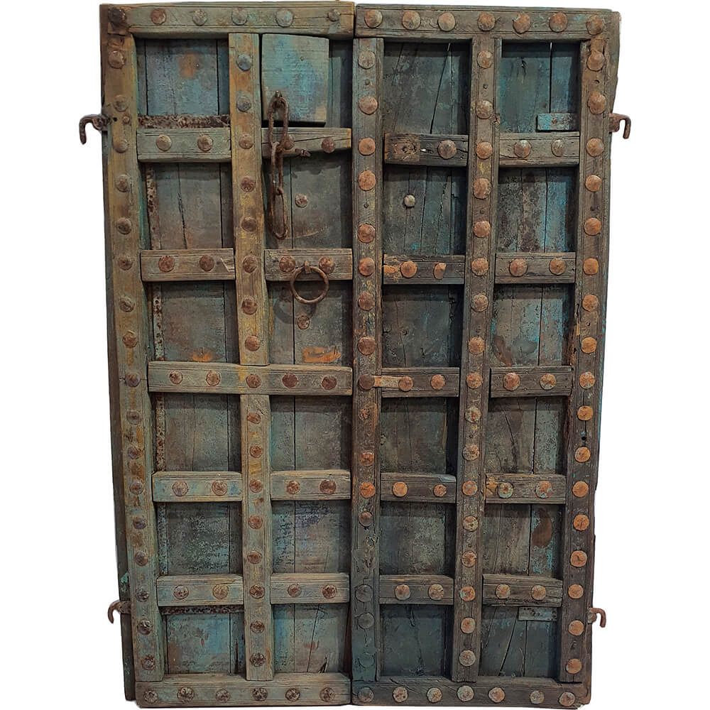 Denne gamle trædør er et markant og autentisk stykke håndværk. Døren er opbygget af massive træfelter, samlet og forstærket med mange originale jernnagler. Træets overflade er præget af tidens gang og viser en smuk, naturlig patina med afdæmpede nuancer af blågrøn, brun og grå, der vidner om mange års brug og slid. De originale jernbeslag, ringhåndtag og låsemekanisme tilfører døren karakter og fortæller historien om dens tidligere liv. Små revner, ujævnheder og spor efter tidligere reparationer er bevaret og giver døren personlighed og dybde.