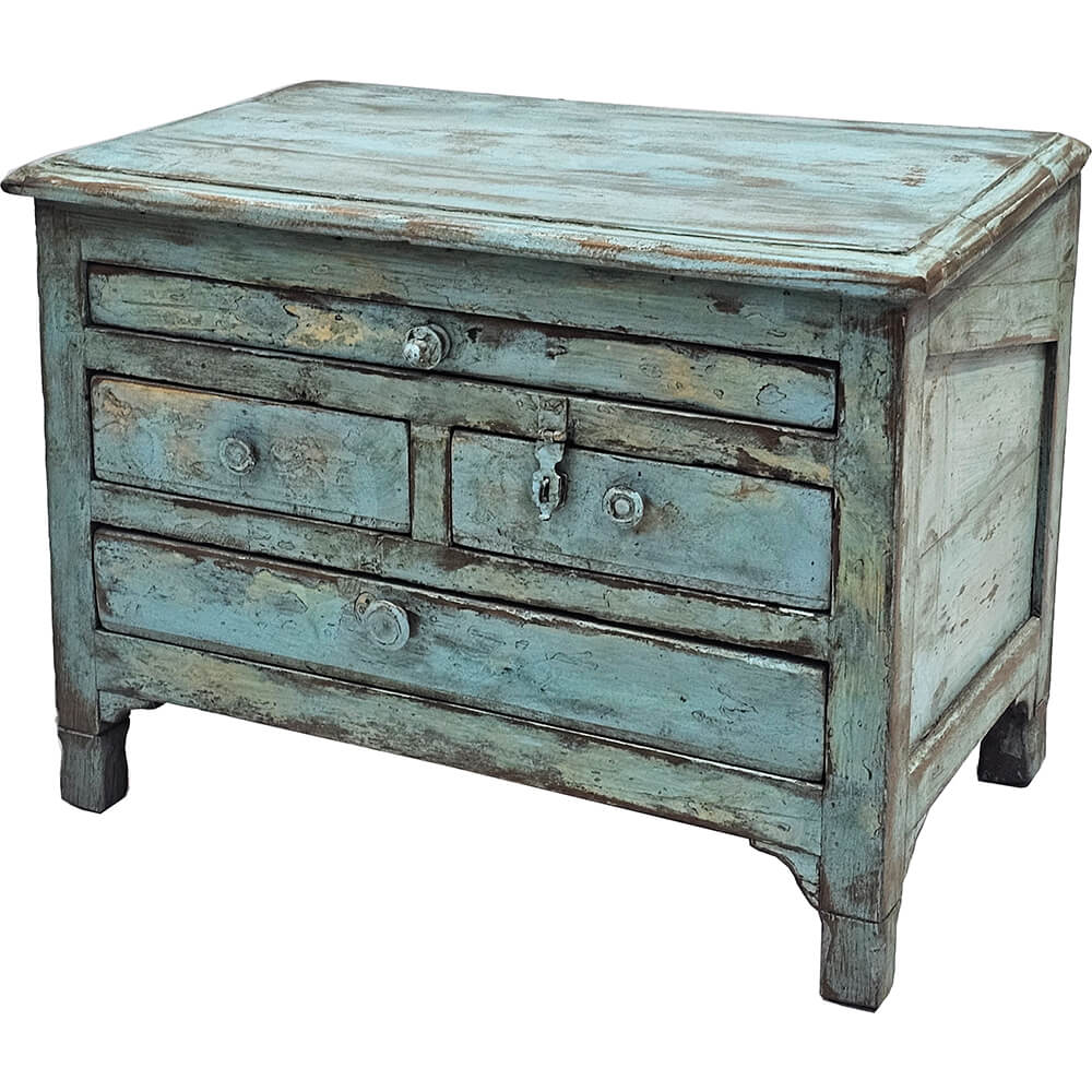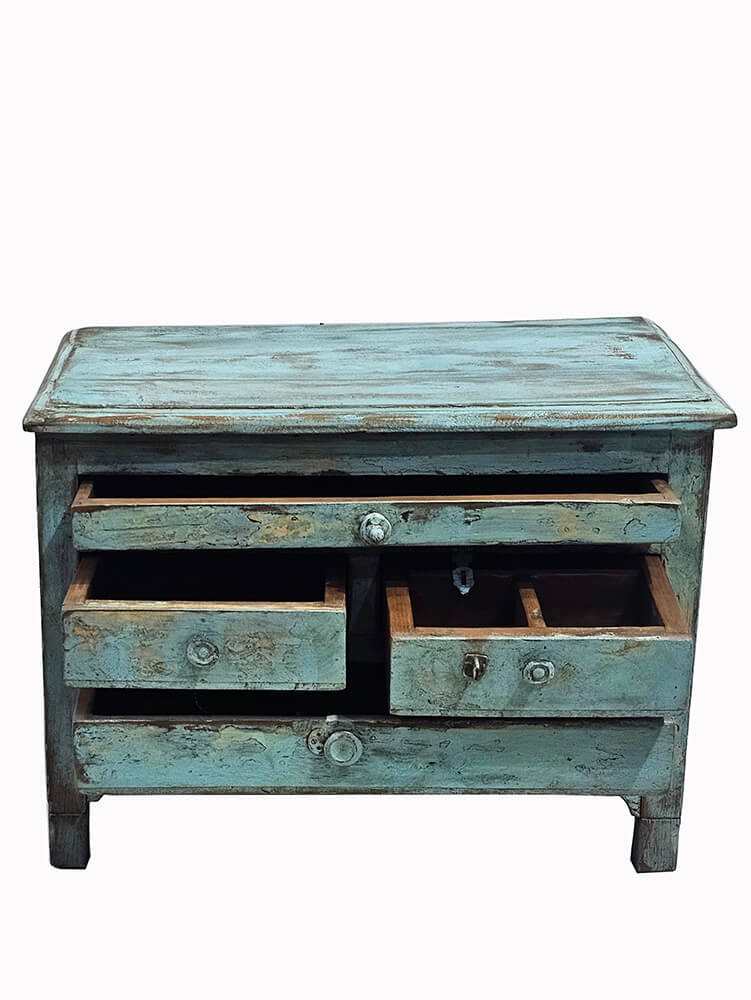 Denne lille, gamle kommode har et charmerende og levende udtryk, hvor tidens spor tydeligt træder frem. Den er malet i en afdæmpet blågrøn nuance, som er smukt patineret med afskallet maling, slid og farveskift, der giver kommoden både dybde og personlighed. Overfladen fortæller sin egen historie og gør kommoden helt unik.